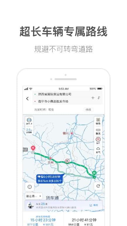 中寰卫星货车通导航针对这一类特殊车辆的驾驶清静举行了产品功效提升。凭证这类超长货车的差别长度限制,团结高精度地图数据,接纳了特殊的蹊径算法,从而能够在路径盘算时举行超长路段的规避,以及可通行蹊径的优先推荐。