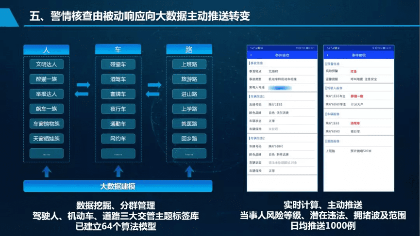 解决计划:世纪高通深入挖掘大数据潜力,立异提出人、车、路三大交管主题标签库,实时盘算当事人危害品级,展望拥堵波及规模,挖掘潜在违法行为,并将上述天生的全量数据实时推送至民警掌心,用大数据武装下层民警。