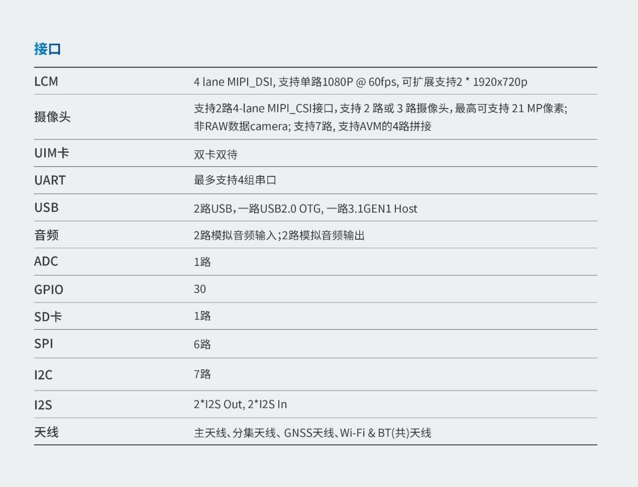 该模组的CPU接纳4核64位ARM Cotex-A53处置惩罚器,主频抵达2.0GHz,内置IMG GE8300 GPU, 支持LPDDR4/4X存储内存,可知足车内-40℃~+85℃的宽温要求 。同时提供功效强盛的多标准音视频编解码器及富厚的外围接口,支持1080P高清显示,可同时实现多路高清视频输入录制 。
