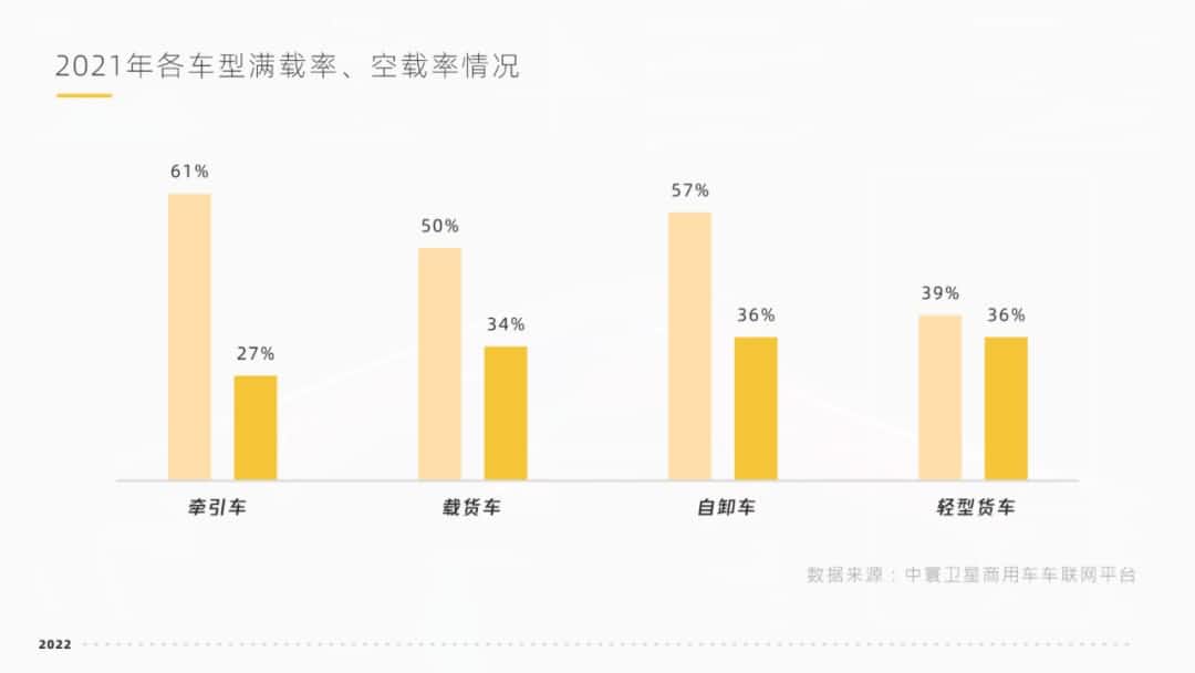 白皮书还通过天下运力平均吨位的上涨反应出车效提升 。据中寰卫星车联网大数据显示,2021年,各车型满载率情形划分为:牵引车60.72%、载货车49.58%、自卸车56.76%、轻型货车39.29%,整体略微提升 。