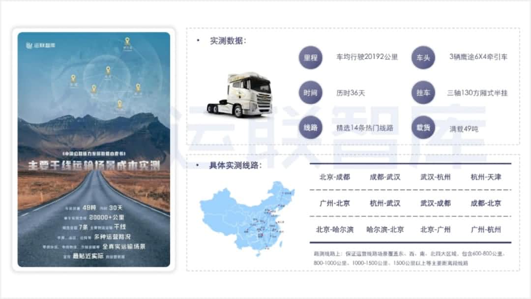 本次白皮书数据泉源分为三块 。其一是宏观大数据,主要来自:国家统计局、交通部、中寰卫星等平台;其二是实测的线路数据,由本次路测方一汽解放测试并提供,并团结中寰卫星车联网大数据举行验证;其三是车队调研数据,由运联研究院针对多条线路车队,举行实地走访完成网络 。运联通过其专业的研究能力、普遍的资源链接、实地的一线走访,把获得的精准真实的运营数据,还原到基础的逻辑层面,形成客观的、系统性的、对行业有价值的剖析与判断 。